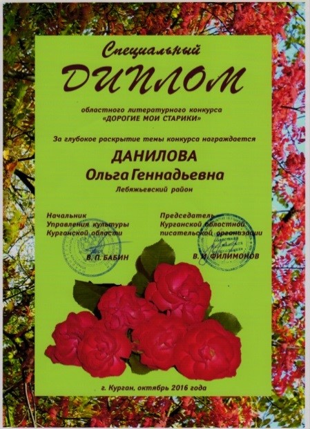 Данилова Ольга Геннадьевна была одной из участниц областного конкурса «Дорогие мои старики», в котором приняло участие 92 человека. При подведении итогов конкурса Ольга Геннадьевна Данилова, член президиума Лебяжьевского районного Совета ветеранов, оказалась в числе победителей. Ей были вручены специальный Диплом конкурса «За глубокое раскрытие темы» и ценный подарок.