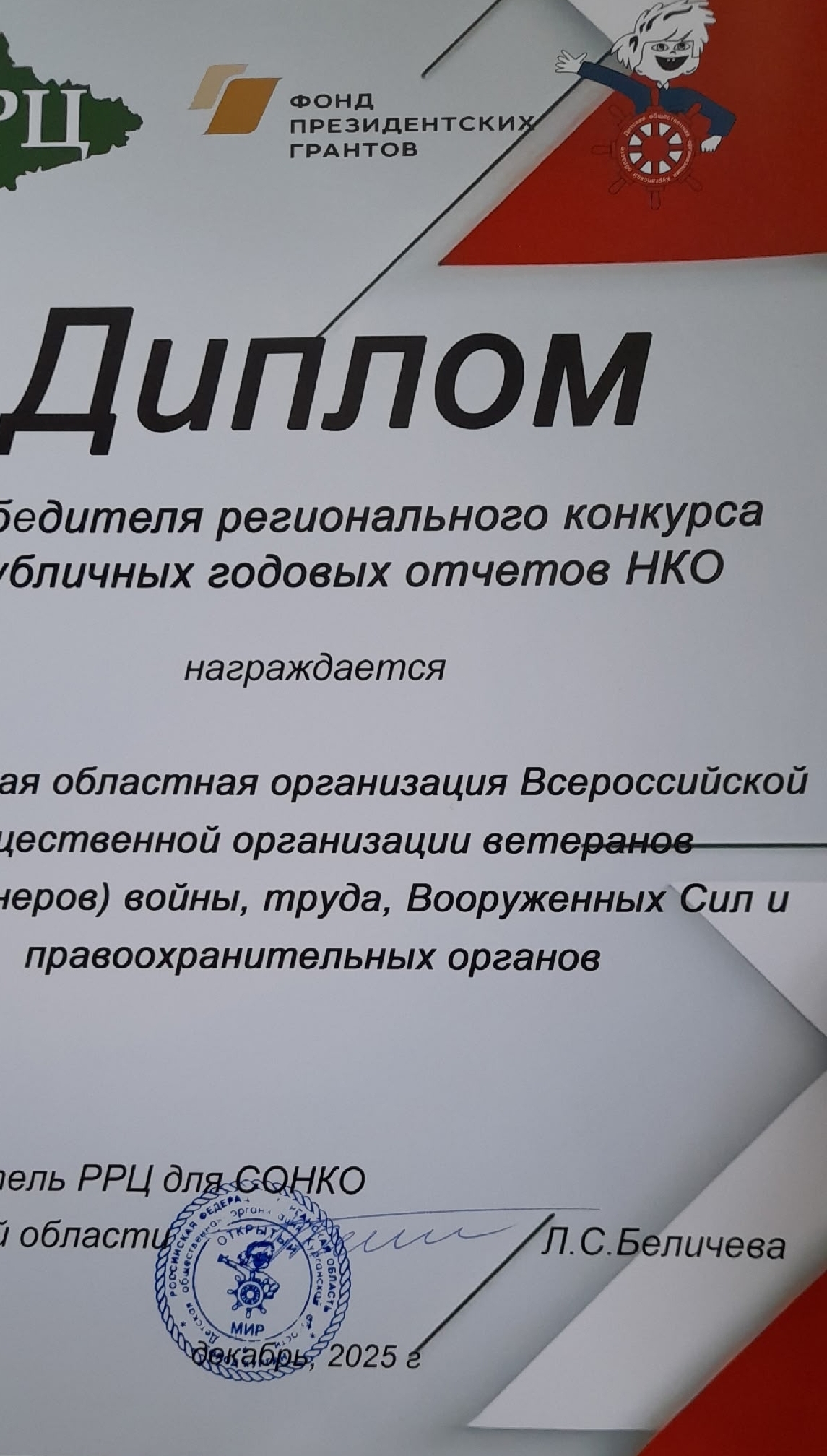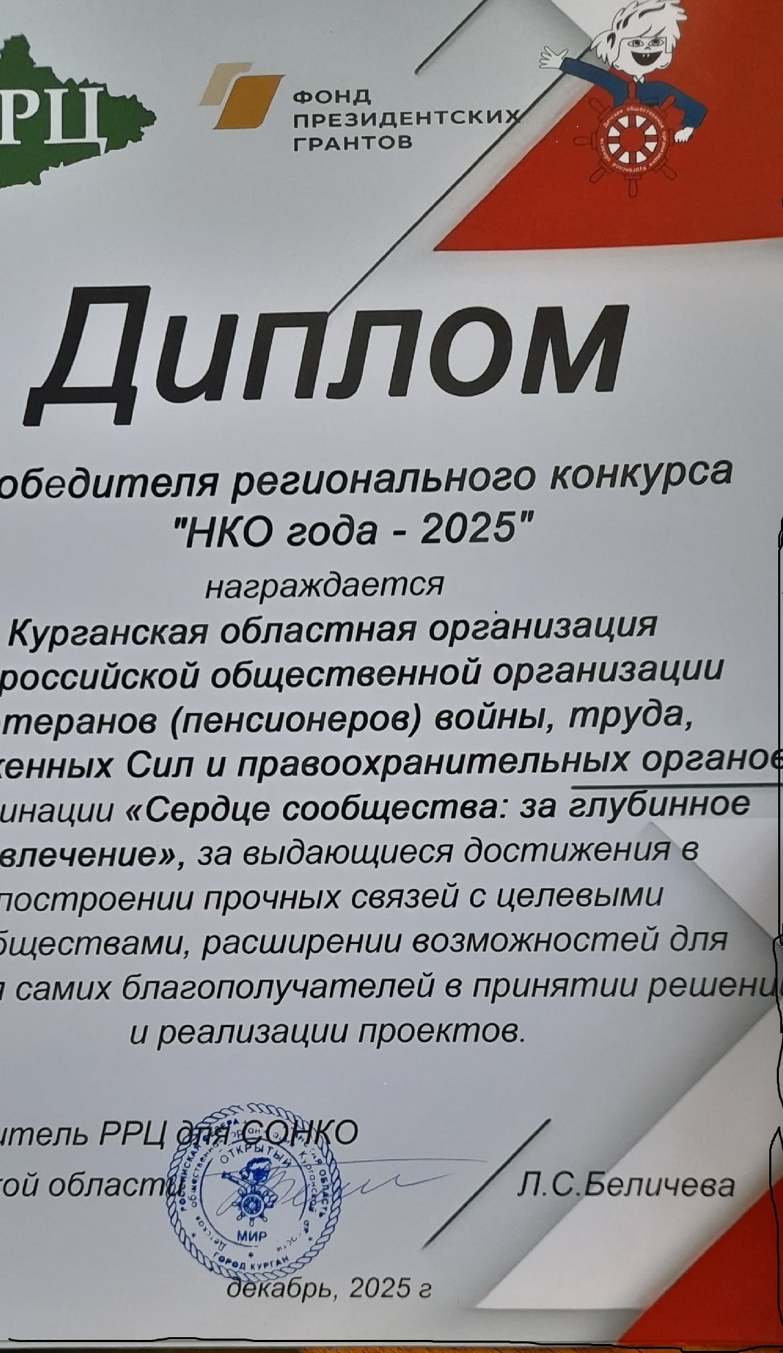 Особенно радует, что наш Совет удостоен двух престижных наград: Диплом победителя регионального конкурса «НКО года-2025»