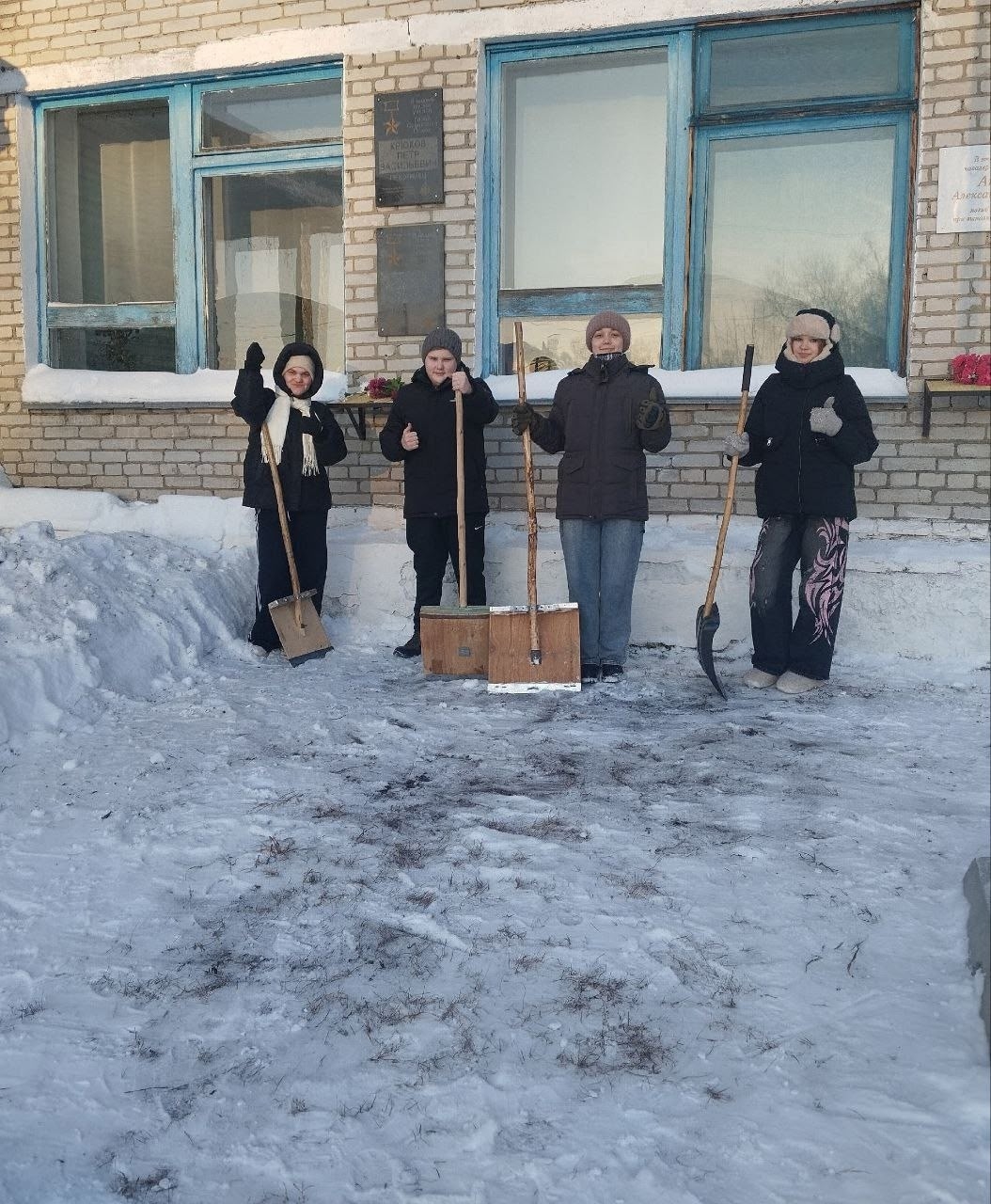 «Снежный десант» Брылинской школы сами расчистили дорожку к Обелиску, убрали снег на территории школы, очистили Мемориальные плиты Героев Советского Союза Копытову С.Л. и Крюкову П.В, и выпускнику школы, участнику СВО кавалеру Ордена Мужества лейтенанту Антонову А.С.