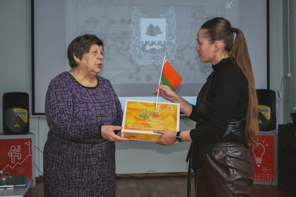На память о встрече Людмила Григорьевна преподнесла ценный подарок библиотеке настольную игру «Народы Курганской области». Благодарим Людмилу Григорьевну и Курганскую общественную организацию «Национальный культурный центр белорусов Зауралья «Батькавщина» за тёплую встречу.
