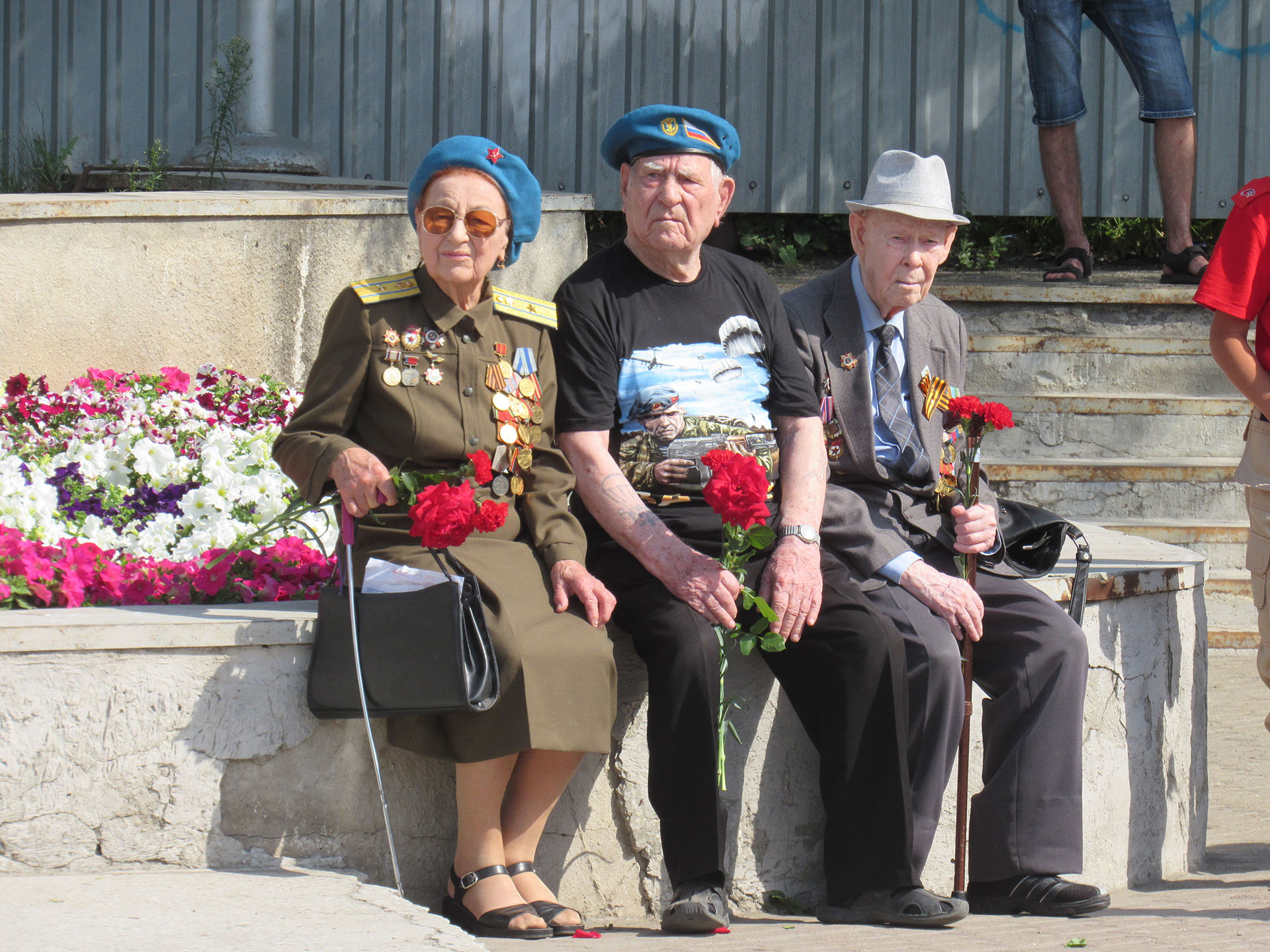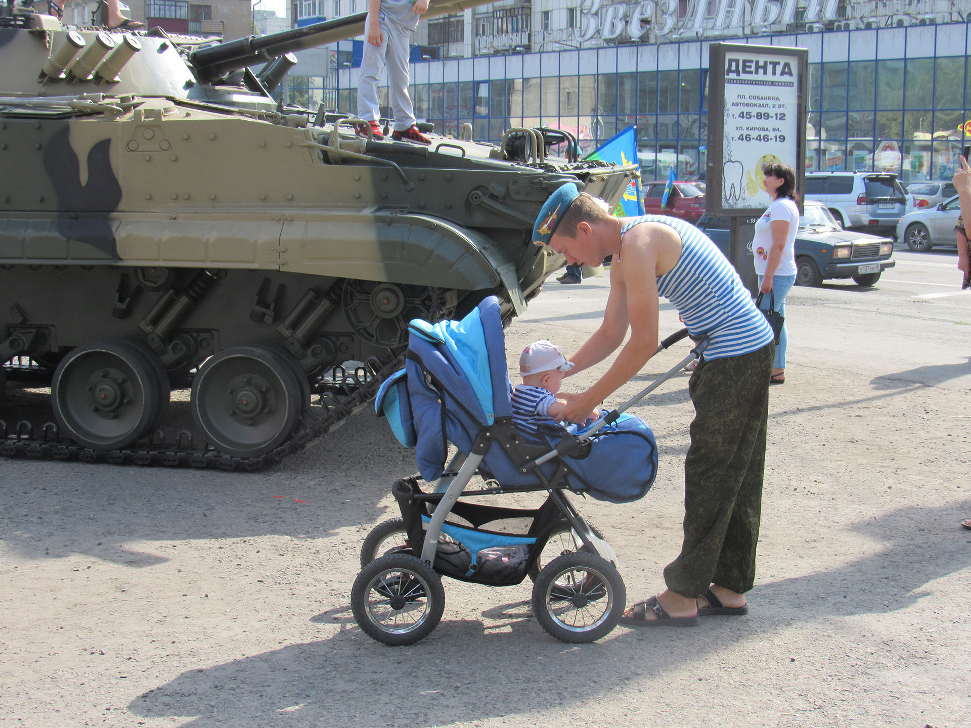 Многие приехали на автомобилях и припарковали их напротив места проведения митинга. Практически из каждой машины виднелся флаг ВДВ, а другие автомобилисты приветствовали десантников протяжными гудками.