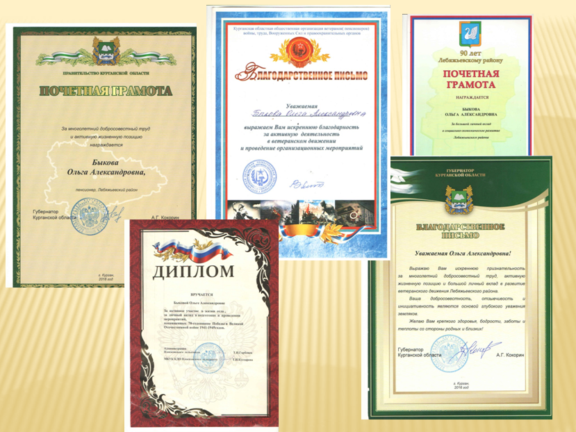 Ольга Александровна имеет заслуженные награды. В том числе Почетную грамоту администрации района за большой личный вклад в социально-экономическое развитие Лебяжьевского района, Благодарственное письмо Губернатора области, Почетную грамоту Правительства области за многолетний добросовестный труд и активную жизненную позицию. А также Благодарственное письмо Курганской областной общественной организации ветеранов за активную деятельность в ветеранском движении.